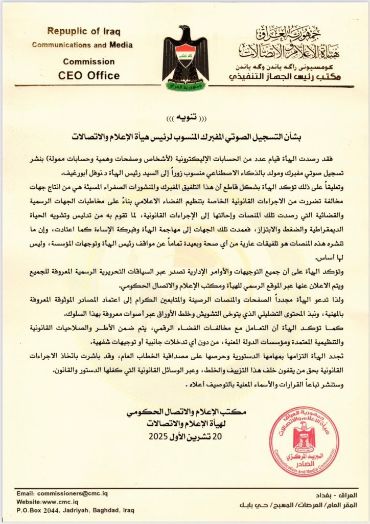 بشأن التسجيل الصوتي المفبرك المنسوب لرئيس هيأة الإعلام والاتصالات