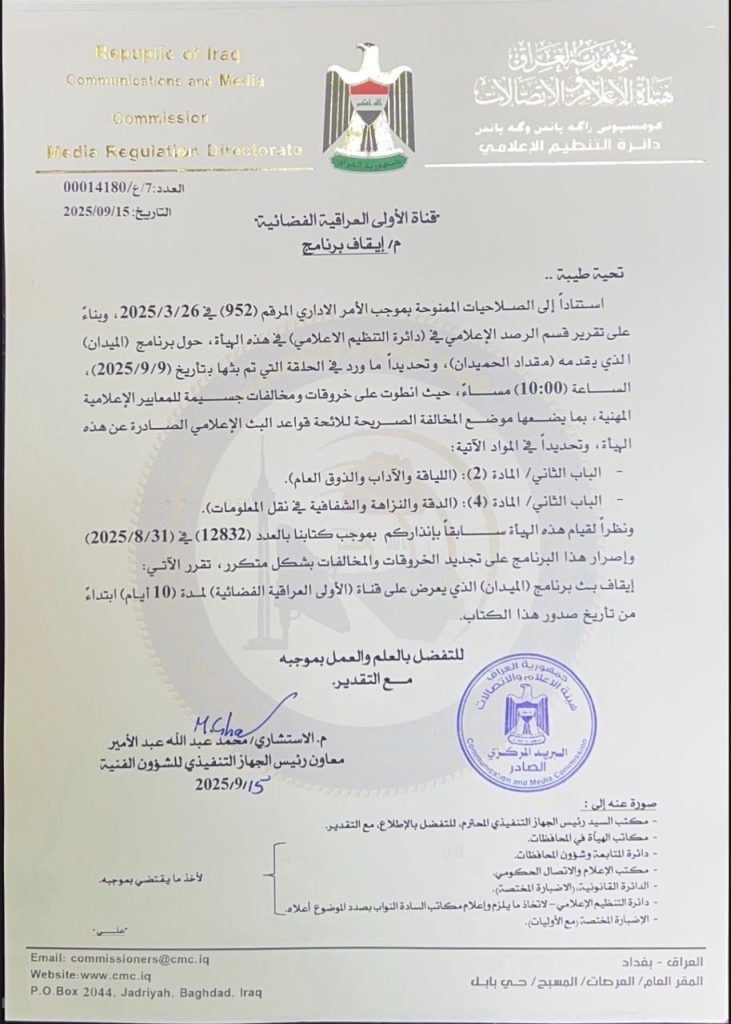 سياسة حميدان يودع الميدان .. الاعلام والاتصالات تقرر إيقاف بث برنامج (الميدان) الذي يعرض على قناة (الأولى العراقية الفضائية) لمدة (10 أيام) . By eastNews سبتمبر 16, 2025